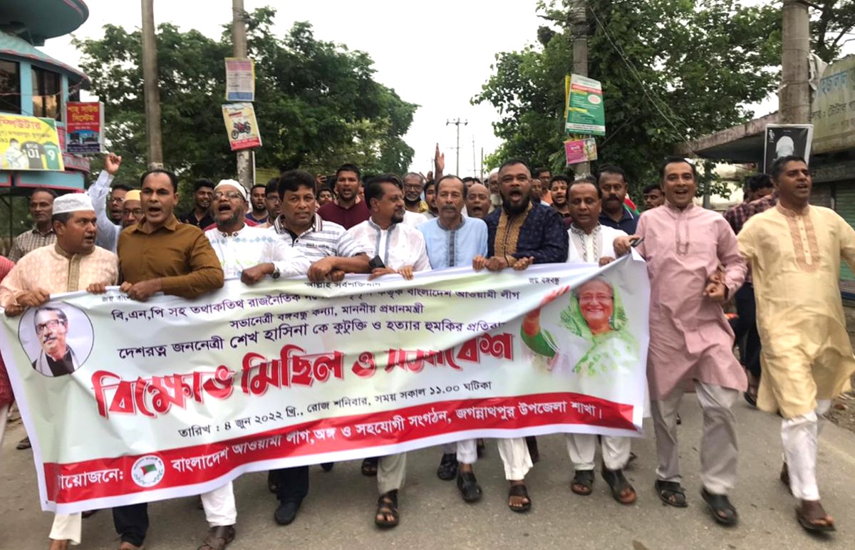 জগন্নাথপুর (সুনামগঞ্জ) প্রতিনিধি।। বিএনপি কর্তৃক প্রধানমন্ত্রী শেখ হাসিনাকে হত্যার হুমকির প্রতিবাদে সারা দেশের ন্যায় সুনামগঞ্জ জেলার জগন্নাথপুর উপজেলা আওয়ামীলীগ ও