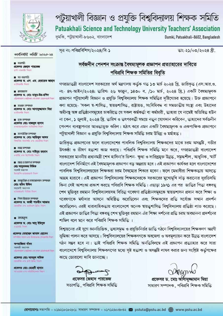 সর্বজনীন পেনশন নিয়ে প্রজ্ঞাপন প্রত্যাহারের দাবি পবিপ্রবি শিক্ষক সমিতির।।