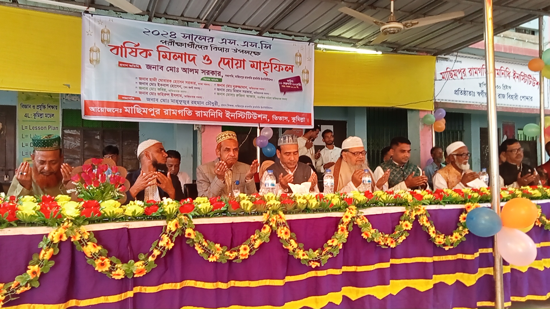 তিতাস-কুমিল্লা-প্রতিনিধি।। কুমিল্লার তিতাসের মাছিমপুর রামগতি রামনিধি ইনস্টিটিউশের এস এস সি পরীক্ষার্থীদের বিদায় উপলক্ষে বার্ষিক মিলাদ ও দোয়া মাহফিল অনুষ্ঠিত হয়েছে।গতকাল