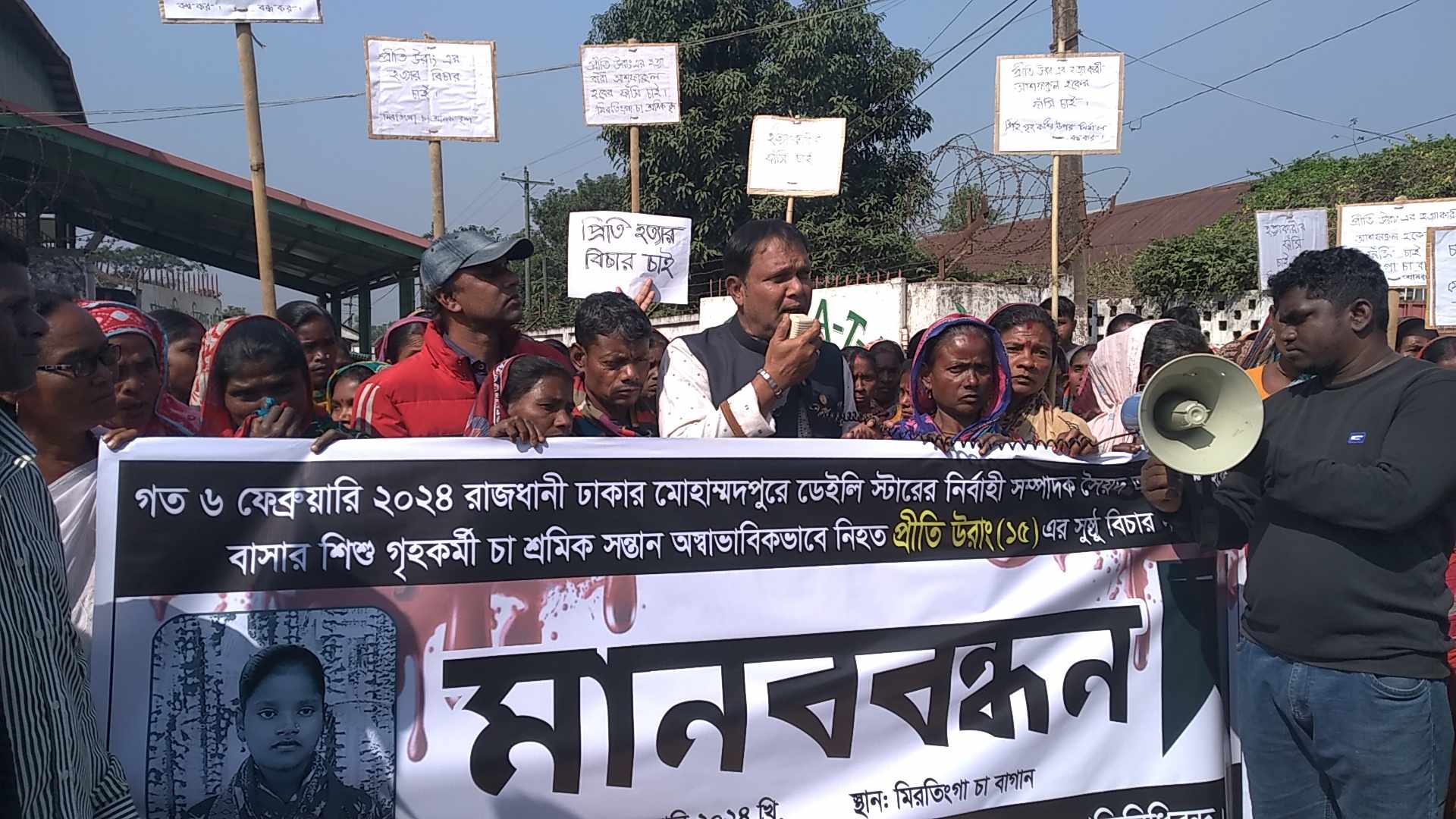 ঢাকায় গৃহকর্মী প্রীতি উরাংএর খুনিদের শাস্তির দাবিতে কমলগঞ্জে মানববন্ধন।।