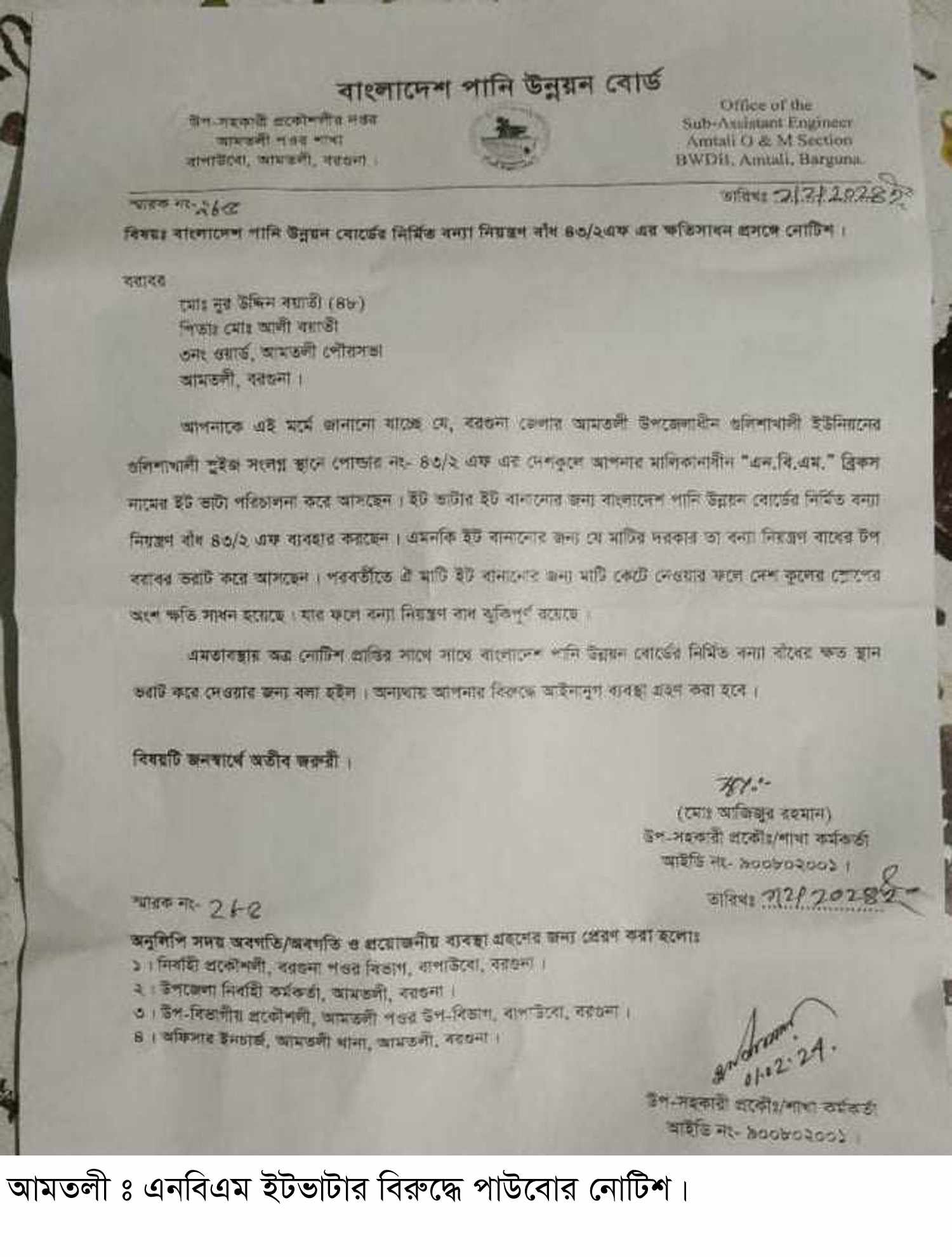 আমতলীর সেই ইটভাটার ছাড়পত্র বাতিল ও পাউবোর নোটিশ।।