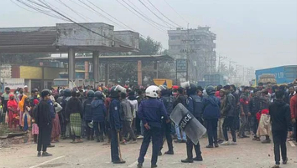 গাজীপুরে সরকার ঘোষিত বেতনের দাবিতে শ্রমিকরা অবরোধ।।