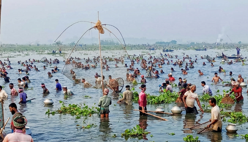 কেউ ঠান্ডায় জবুথবু তবুও রুই কাতলা গজার মাছ ধরতে রুহুল বিলে হাজারো মানুষ ভিড়।।