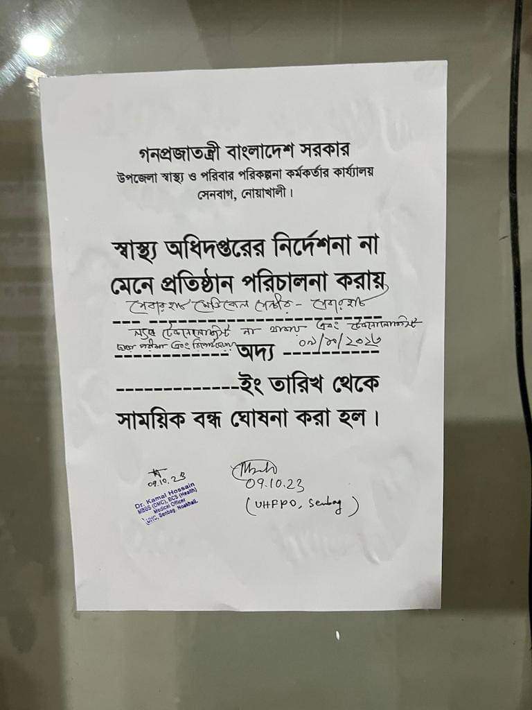 নোয়াখালী প্রতিনিধি।। নোয়াখালীর সেনবাগে সেবারহাট মেডিকেল সেন্টার নামে একটি ডায়াগনস্ট্রিক সেন্টার বন্ধ ঘোষণা করে দিয়েছে স্বাস্থ্য বিভাগ।