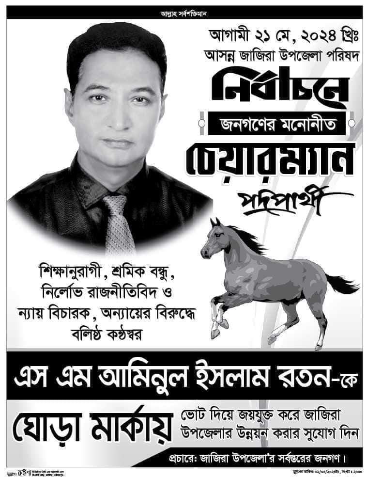 শরীয়তপুর প্রতিনিধি।। শরীয়তপুর জাজিরা উপজেলা পরিষদ নির্বাচনের নির্বাচনী মিছিলে জীবন্ত ঘোড়া ব্যবহার করায় চেয়ারম্যান প্রার্থী এস এম আমিনুল ইসলামকে শোকজ