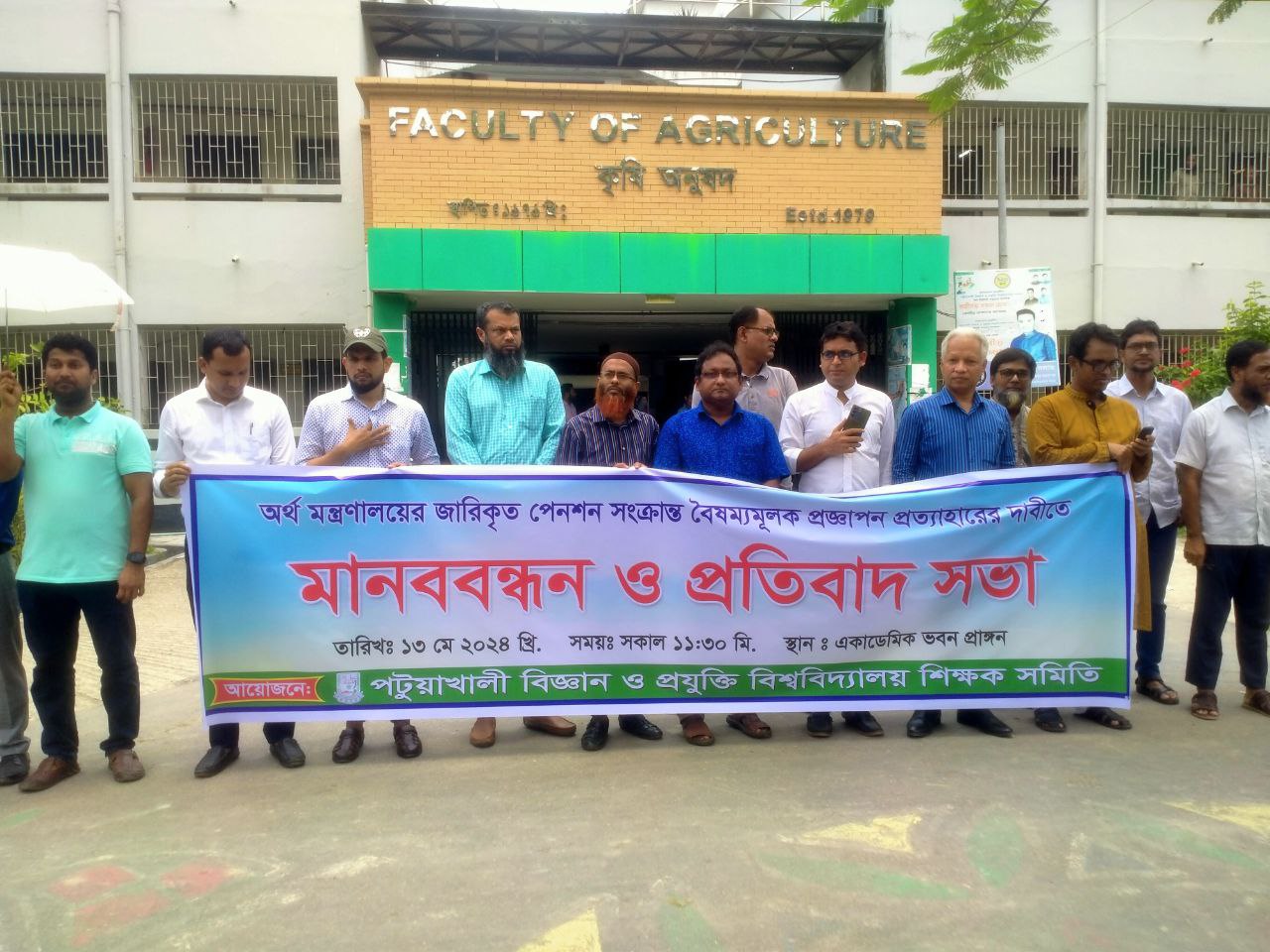 সর্বজনীন পেনশন প্রজ্ঞাপন বাতিলের দাবিতে পবিপ্রবি শিক্ষক সমিতির মানববন্ধন।।