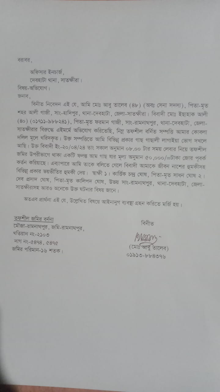 দেবহাটায় সেনা সদস্যর গাছ কাটায় থানায় অভিযোগ।।